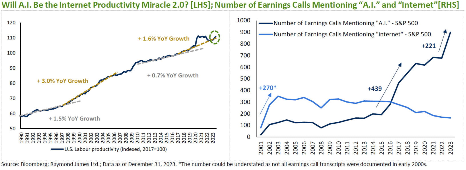 Finding a market commentary in 2023 that didn't mention the “Magnificent Seven” was quite a challenge. Artificial Intelligence (A.I.) was a significant catalyst driving the remarkable outperformance of these stocks last year. After such an impressive reaction, we must question if the exuberance is overdone in the short term, or if we see this as just the beginning of an A.I. wave, comparable to the Internet boom in the late 1990s, with an impact that could be profound and far-reaching, extending across sectors over decades. We believe the latter is more likely and anticipate numerous investment opportunities emerging across various sectors as A.I. enhances productivity and profitability, extending beyond the Magnificent Seven in the coming years. We find ourselves in an exciting era, over 70 years after Alan Turing published "Computer Machinery and Intelligence", as A.I. has more recently gained broader attention and adoption by companies outside the information technology sector, and we expect this to only accelerate.